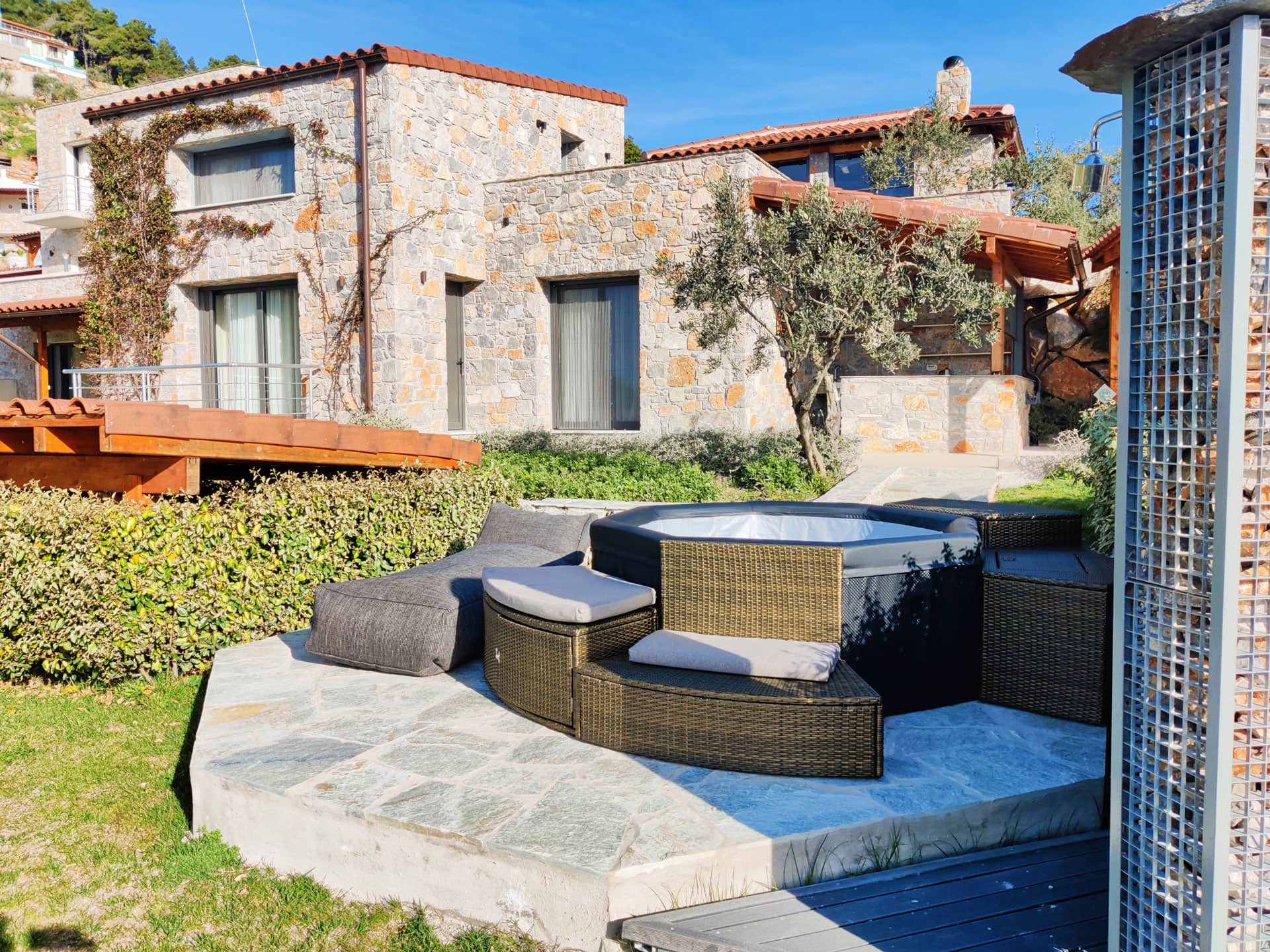Nel giardino del vostro villino, troverete una jacuzzi per rilassarvi in qualsiasi momento della giornata e una cucina esterna dove poter preparare ottime cene.